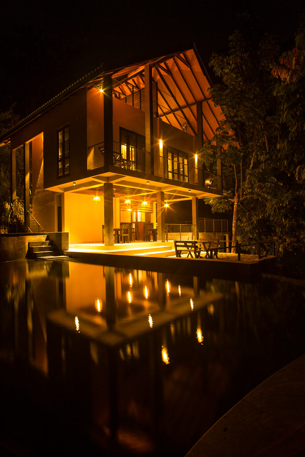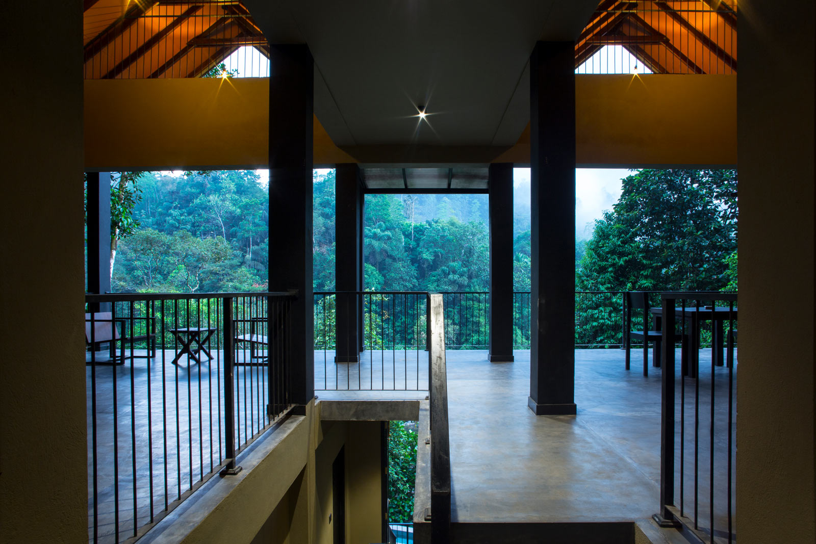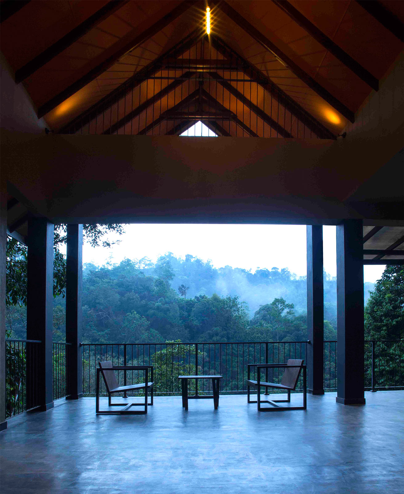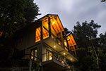 The resort indulges a soothing, earthy color palette mingling easily into the surrounding nature. It's timber decks, gable roof, and vast open spaces ease the guests with the thriving rainforest, waterfalls and an abundance of wildlife. The artful frames created by the elements of the building captures the magnificent landscapes that perfectly bridge the interior and exterior. The form of the building is set to bring the natural environment into the building by visually linking the spaces to a greater extent. The resort also houses an infinity pool of natural water that blends into the lake with a spectacular view of mountains beyond.